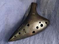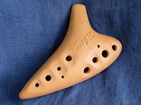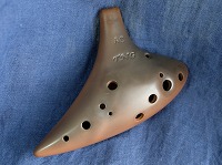 コメント:少なめの息で吹けます。土のパイプオルガンと称されるほど芯のある太い温かみのある響きで知られている楽器です。高い温度で焼き締められた本焼きのオカリナで、息の反応も速く、息を吹き込むと同時に「ポッ」と音が出ます。音階のバランスも悪くないです。最高音まで良く響きます。それでいて最低音もしっかりボリュームがあります。全体的に平べったく、持ちやすい形です。ティアーモ運指のため、右人差し指手前に低音ラで使う小穴が空いています。 |