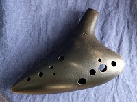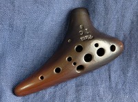 コメント:通常のソロモデルに比べてもズシッと重みがあります。特に息が入り強い息で吹ける楽器です。この楽器なら広いホールのステージの上で朗々と歌い上げることができます。弱い息では鳴らせないためオカリナ入門者には不向きです。強い息が必要なのですが、音は不思議とやわらかく、音に圧力をそこまで感じません。大きな音ですが響きがやわらかいのがこのオカリナの最大の特徴かもしれません。重みと深い温かみのある音色は大いに魅力です。状態の良い最良品と評価します。 |