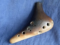 コメント:普通の息で吹け、土笛らしい温かみのある音色の楽器です。音程のバラツキも特には見られません。吊り下げ用の環はありません。作者の銘はなく試作品か、仕上げ前の楽器と思われます。指穴の配置もごく一般的で演奏性も良好です。塗装は簡易的で、指穴周辺の塗装はがれが見られます。哀愁系のオカリナが大好きな人は喜んでいただけるのではと思います。お手製感満載オカリナです。 |