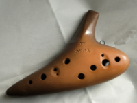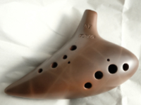 コメント:やや強めの息で吹けます。息を入れると弾力(返ってくる力)を感じます。そのため自然な息のコントロールが生まれ、表情が生まれます。音色は素朴で柔らかく、温かみがあります。低音から高音まで芯があり、かすれずよく響きます。軽く、指穴も小さめなので、指の小さい方にも吹きやすいオカリナです。全体的に美品です。 |