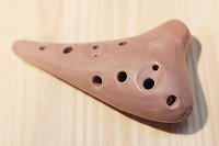 千葉県成田市に工房をかまえ、優しい響きをコンセプトに製作に取り組まれています。 独特な色は古万古(こばんこ)という赤色の土を利用することによって得られたもので、表面のきめの細かさが指先を通じて感じることのできる楽器です。容姿も美しく、手の平にすっとなじむ形状です。吹き口には食器にも使える植物原料のニスを塗布されています。