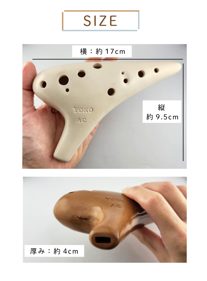 陶器製オカリナのアルトC管は大体250グラムから350グラムほどですので、YOKOオカリナは「軽いオカリナ」になります。